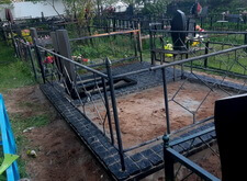 В первую очередь мы очистили территорию участка от сорной травы и прочего мусора. Обойтись совсем без демонтажа не получилось, однако мы сохранили нетронутым ограждение участка. Для создания чёткого периметра будущей могилы, мы подготовились к заливке опалубки.