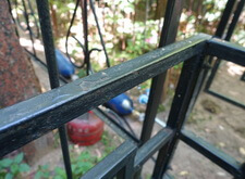 Последовательность работы стандартная. Во-первых, сжечь старую краску, во-вторых, зачистить ограду до металла, после покрыть грунтом чистый металл и покрасить черной краской. После покраски убраться на могиле. Далее на фото обожженная краска на ограде.