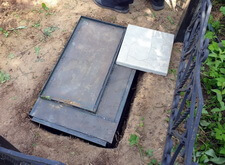 Первым делом мы взялись за установку саркофага: изготовив предварительно саркофаг, размещаем его на могиле под уровнем плитки. Предварительно территория места захоронения была полностью очищена от сорняка и прочего мусора.